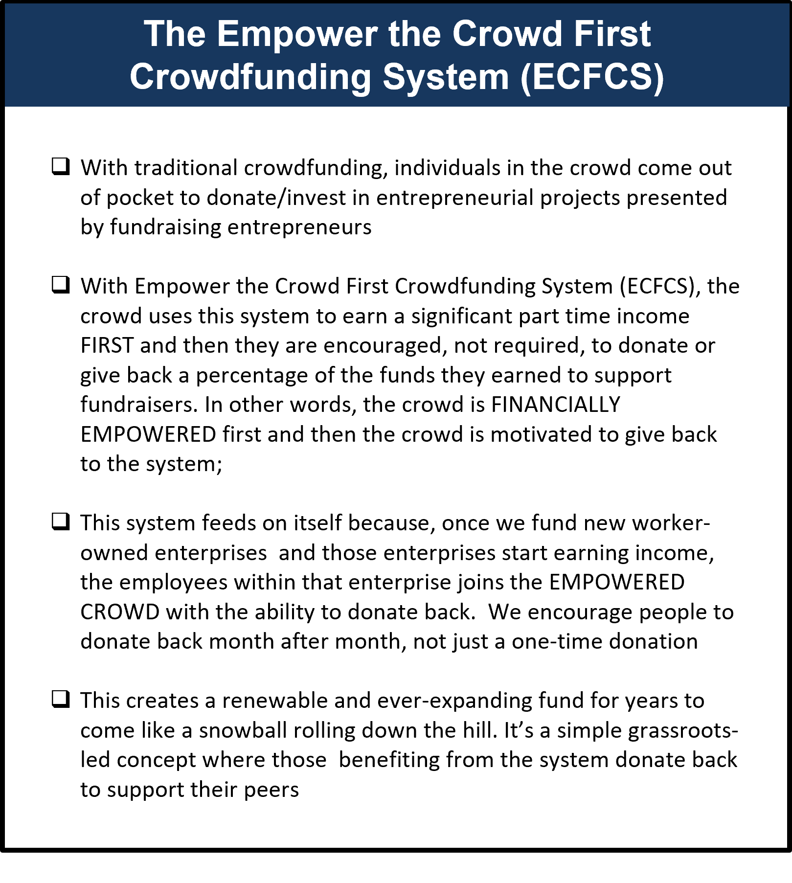 As individuals earn income and accumulate wealth, they are encouraged—though not obligated—to contribute a percentage of their earnings to help fund the creation of new worker-owned enterprises. This initiative is formally known as the Empower the Crowdfund First Crowdfunding System (ECFCS) where those earning income is considered the EMPOWERED CROWD;