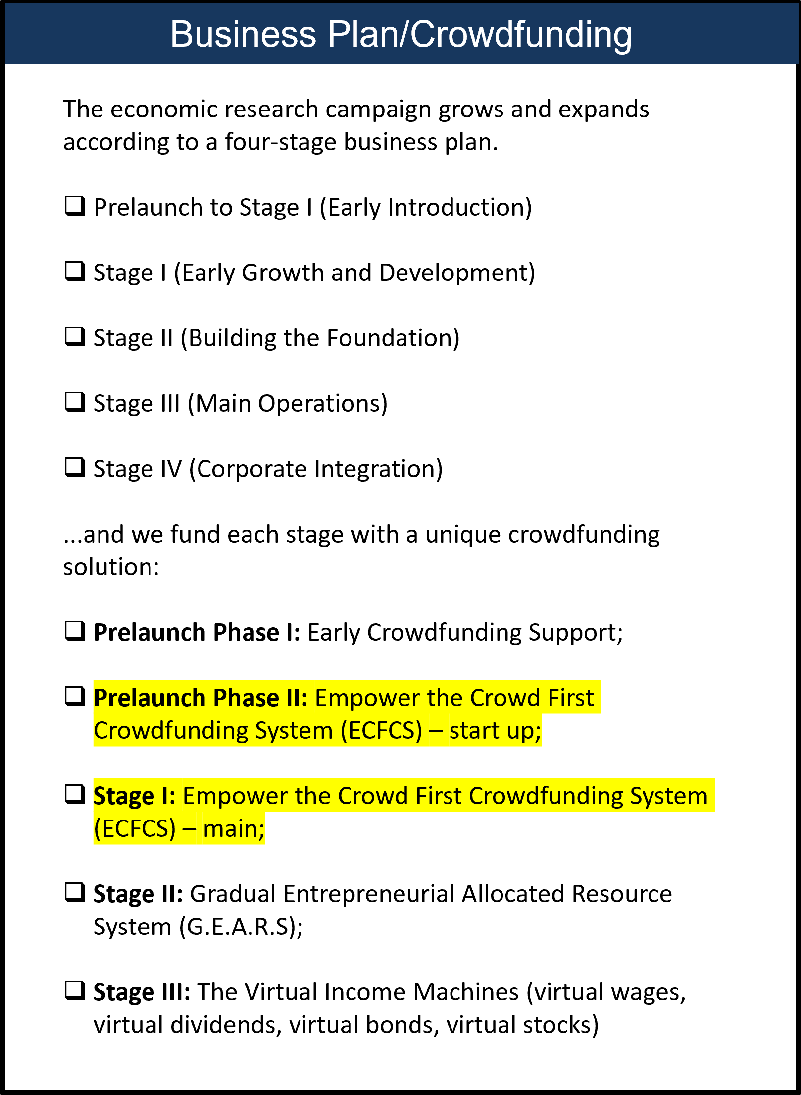 We are bringing together aspiring entrepreneurs, career professionals, home-based small business owners, and affiliate/referral marketers to build and operate a new peer-to-peer system. Our operations are guided by a four-stage business plan, utilizing the Empower the Crowd First Crowdfunding System (ECFCS) as our foundational collaborative crowdfunding solution. We also introduce and test a new worker-ownership compensation model called the Empowered Employee Compensation Model (EECM);