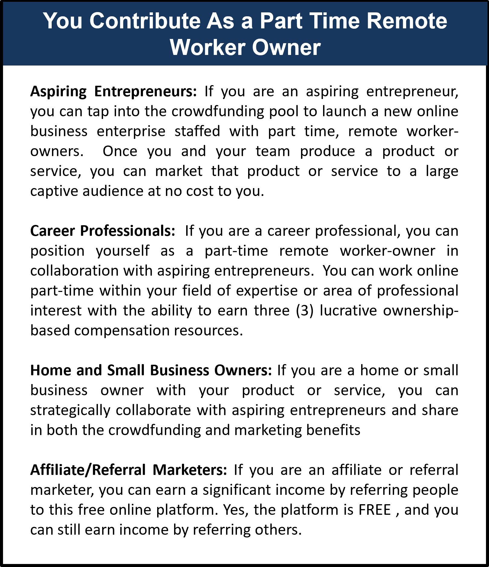 These new worker-owned enterprises will primarily be staffed by part-time remote worker-owners, providing grassroots individuals the opportunity to work online part-time while building substantial wealth;